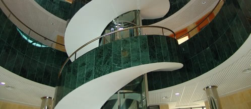 En la planta baja se sitúa un gran vestíbulo de más de 300 m2 donde se aloja un ascensor panorámico que permite llegar a las tres plantas superiores y que está rodeado de una amplia escalera circular construida en acero inoxidable.